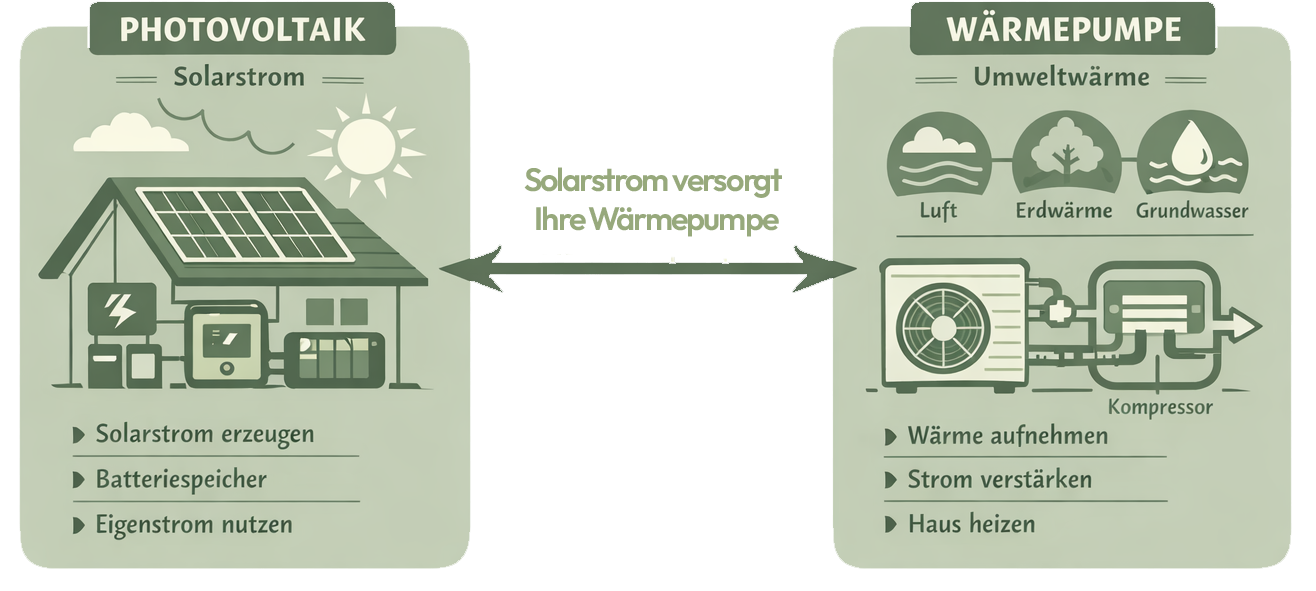 Photovoltaikanlagen erzeugen sauberen Solarstrom direkt auf dem eigenen Dach. Dieser Strom versorgt die Wärmepumpe, die Umweltwärme aus Luft, Erde oder Grundwasser nutzt, um Ihr Zuhause zu heizen und Warmwasser bereitzustellen. Durch die Kombination beider Technologien steigern Sie Ihren Eigenverbrauch, senken langfristig Ihre Energiekosten und reduzieren Ihren CO₂-Ausstoß deutlich. Mit optionalen Strom- und Wärmespeichern kann die selbst erzeugte Energie noch effizienter genutzt werden